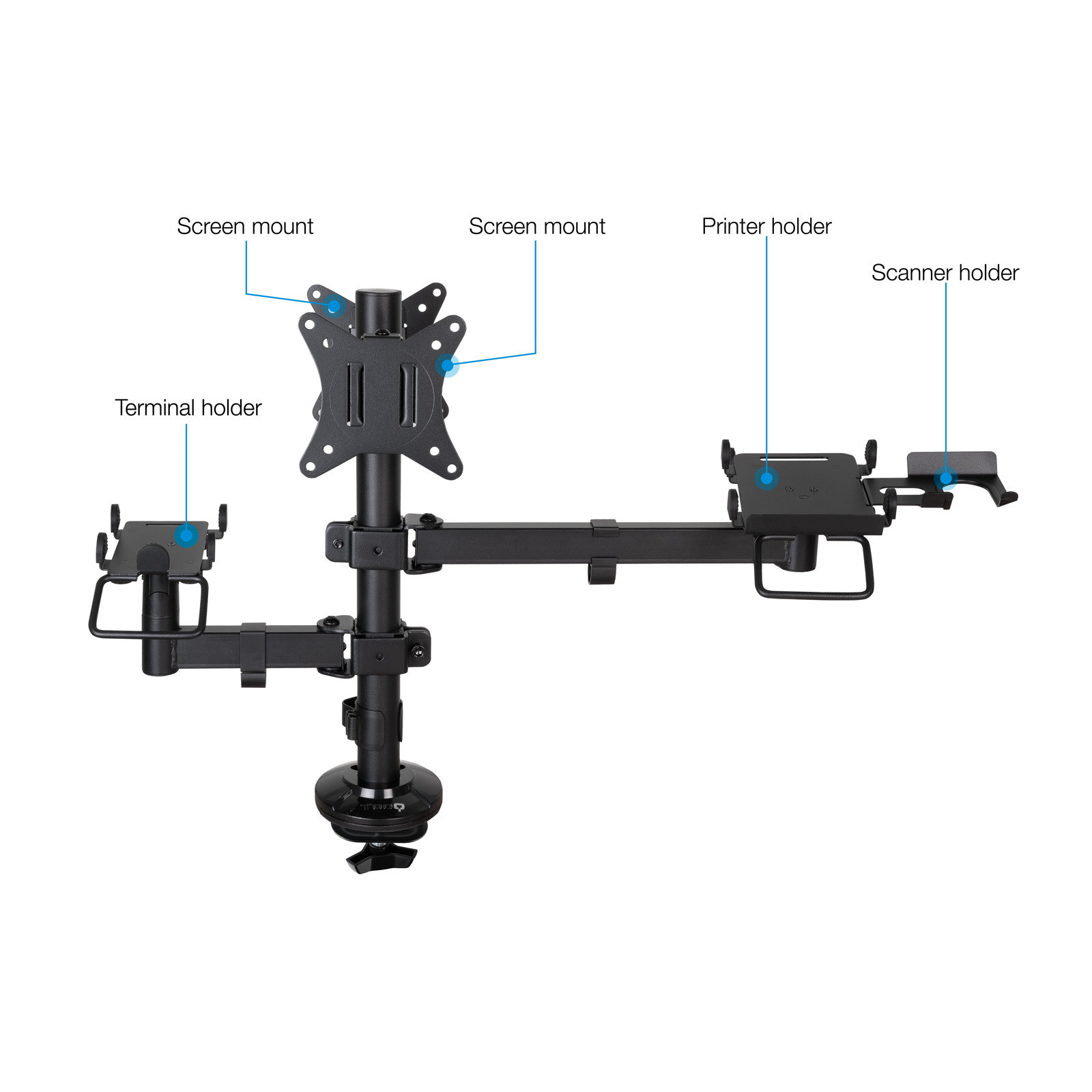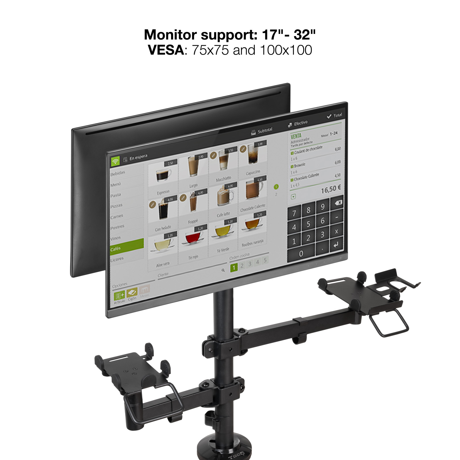Optimiza tu punto de venta con el Soporte AVPos Multi-Stand, la solución definitiva para organizar tu TPV. Este brazo articulado permite montar dos monitores de hasta 32″, una impresora de tickets y un terminal de pago, creando un espacio de trabajo profesional, ergonómico y despejado. Su robusta construcción en metal y sistema de gestión de cables garantizan una instalación limpia y duradera.