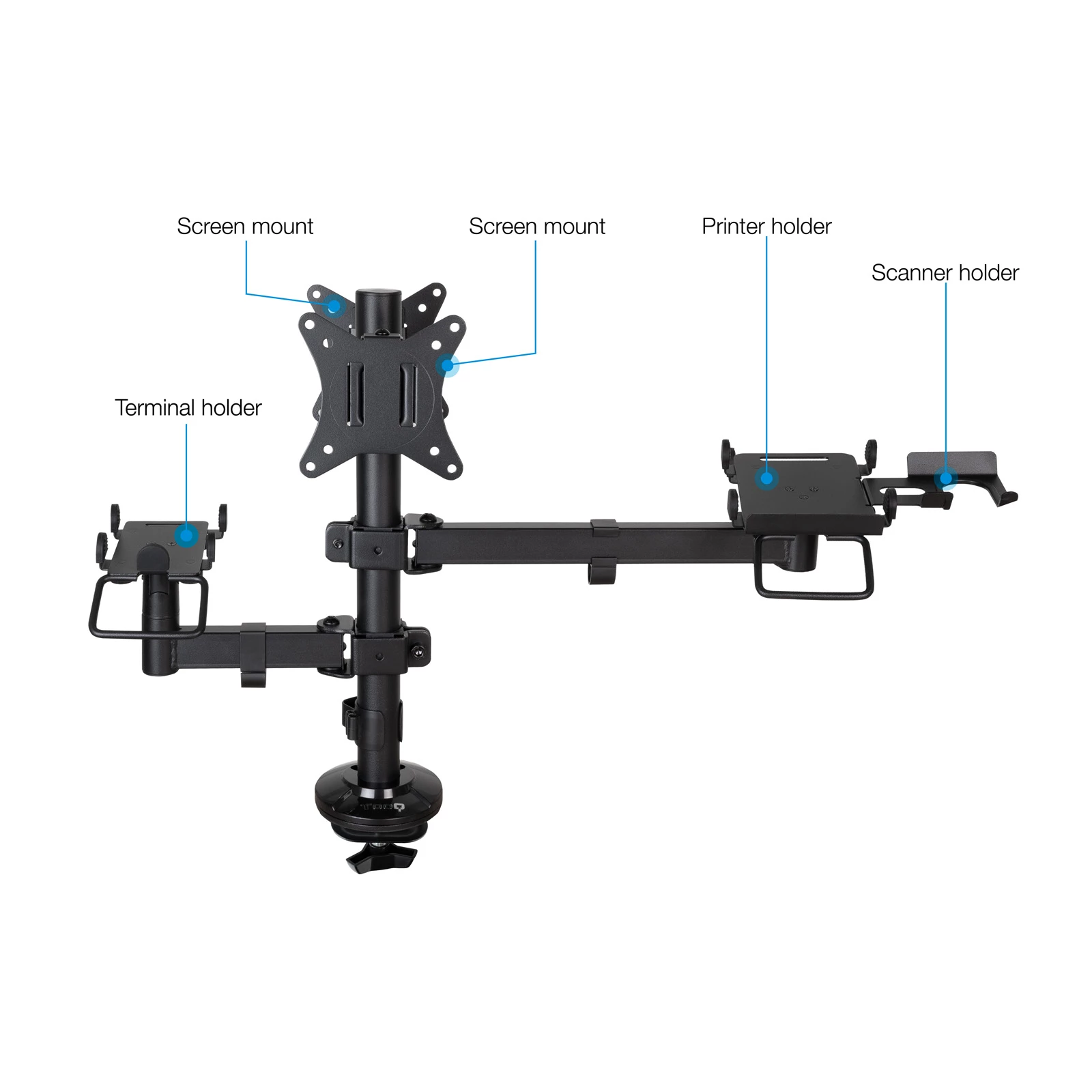El AVPos Multi-Stand es un sistema de montaje modular y de alta resistencia, diseñado para crear un puesto de TPV completamente integrado y ergonómico. Libere espacio en su mostrador y mejore la eficiencia operativa montando todos sus periféricos esenciales en un único y robusto soporte. Con capacidad para dos pantallas, una impresora y un datáfono, este soporte se adapta a cualquier configuración de punto de venta. Sus brazos totalmente articulados permiten un ajuste preciso de la altura, inclinación, giro y rotación de los monitores, asegurando siempre el mejor ángulo de visión tanto para el operario como para el cliente.
