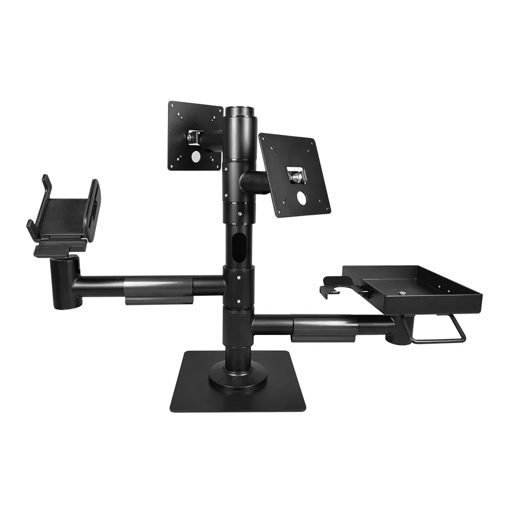 El AVPos Multi-Stand es un sistema de montaje modular y de alta resistencia, diseñado para crear un puesto de TPV completamente integrado y ergonómico. Libere espacio en su mostrador y mejore la eficiencia operativa montando todos sus periféricos esenciales en un único y robusto soporte. Con capacidad para dos pantallas, una impresora y un datáfono, este soporte se adapta a cualquier configuración de punto de venta. Sus brazos totalmente articulados permiten un ajuste preciso de la altura, inclinación, giro y rotación de los monitores, asegurando siempre el mejor ángulo de visión tanto para el operario como para el cliente.